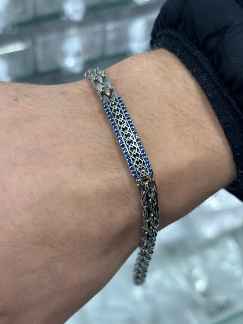 سوار الفضة الملكي باللون الازرق الملكي للرجال من الفضة الخالصة عيار 925 هو قطعة مجوهرات أنيقة وراقية، مما يجعلها بالتاكيد لجذب الأنظار. مصنوع من الفضة الخالصة عالية الجودة، صُمّم هذا السوار ليكون قويًا ويعطي لشخصك مظهر للثقة والقوة.