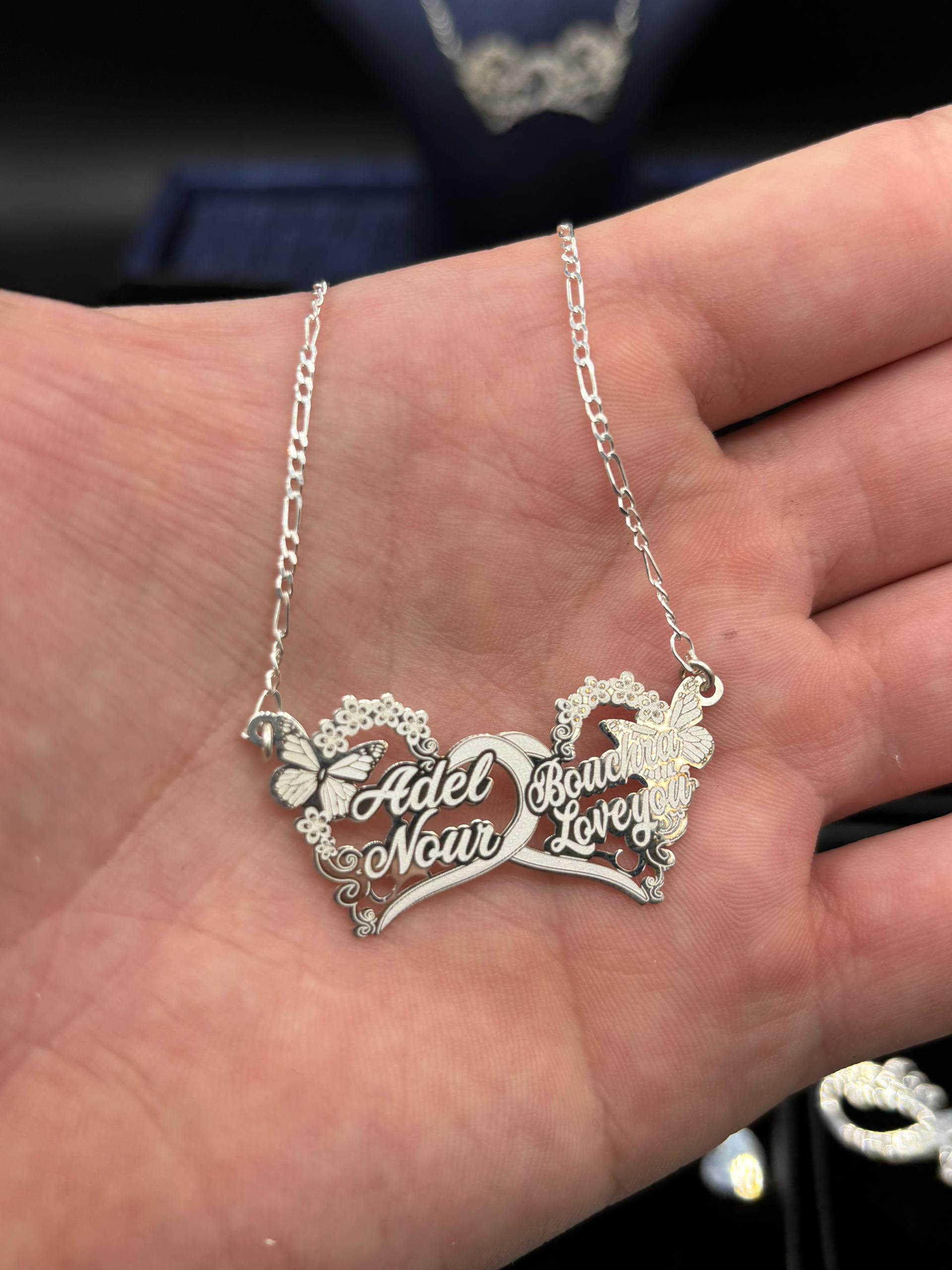 قلادة قلوب الحب باسمك واسم من تحب على شكل علامة مالانهاية رمز للحب الابدي مصنوعة في ورشتنا باسمك واسم من تحب من الفضة الحرة 925 مع تشليلة من الذهب 24 قيراط افضل هدية لمن تحب , هدية فاخرة للمناسبات